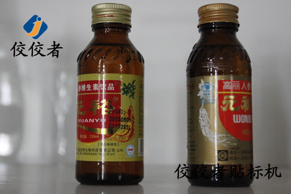 客戶所用的標簽為不干膠標簽,尺寸也同一種,只是標簽內(nèi)容不太一樣。分別對應不同顏色蓋子的產(chǎn)品。能貼高麗人參飲品的產(chǎn)品是我司標準機器的手動圓瓶貼標機,半自動圓瓶貼標和全自動圓瓶貼標機。
