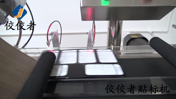 (圖3)展示的是凹面塑料盒雙標頭貼六張商標(第二個標頭針對同一列位置連續(xù)貼兩張商標),作業(yè)方式:由圖2第一個標頭貼完四張商標后傳輸帶帶動進入第二個貼標頭(由圖3 從左到右數(shù)起第二個測物電眼識別到產(chǎn)品貼標位置,啟動程序時間第二個貼標標頭出標完成第五張商標同時覆好商標,依此類推完成第六張商標。至此,貼標過程就已經(jīng)完成了. (操作過程:傳輸帶動來料產(chǎn)品—>第一個貼標頭貼好四張商標并覆標(設備自動實現(xiàn))—>第二個貼標頭貼好兩張商標—>傳輸帶帶動進入下一道制作藝流程。)如以下(圖4 圖5):