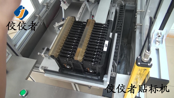 上圖展示的就是硬盤貼標機正在貼標的動作。貼標時,貼標頭上下移動完成貼標及吸標的過程(在這個過程中同時還進行了剝標工作,隨后進行吸標及貼標的過程.)硬盤貼標機的治具會根據光纖感應將未貼標的硬盤移動到貼標頭垂直方向下配合貼標,一次貼標可完成30個硬盤的貼標,產品數量可根據客戶實際情況進行增加或減少,下一步就是將治具取出,如下圖: