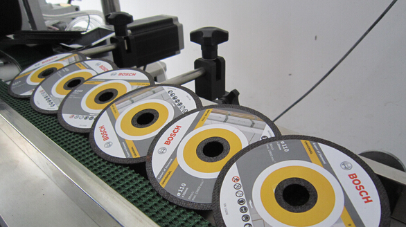 上圖的這個產品是我公司貼標機系列下專用貼標機系列下的全自動砂輪片專用貼標機對砂輪片進行貼標的樣品圖片.這張圖片是在產品上面時行拍攝的.背景中的設備便是我公司的全自動砂輪片專用貼標機了.