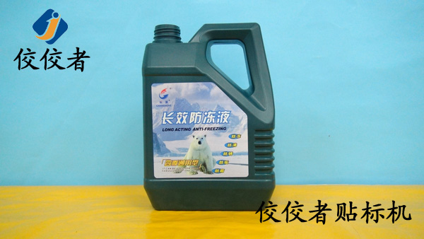 上圖中可以看到瓶子一共經過了兩道門,第一道門是給瓶子貼標的,那么第二道門呢?呵呵,這個是 用來鞏固標簽的貼合效果的,我們來一起看看防凍液瓶子貼標機的貼標樣品吧。